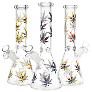 Stylized Hemp Leaf Glow in Dark Glass Water Pipe - 10" / 14mm F / Colors Vary